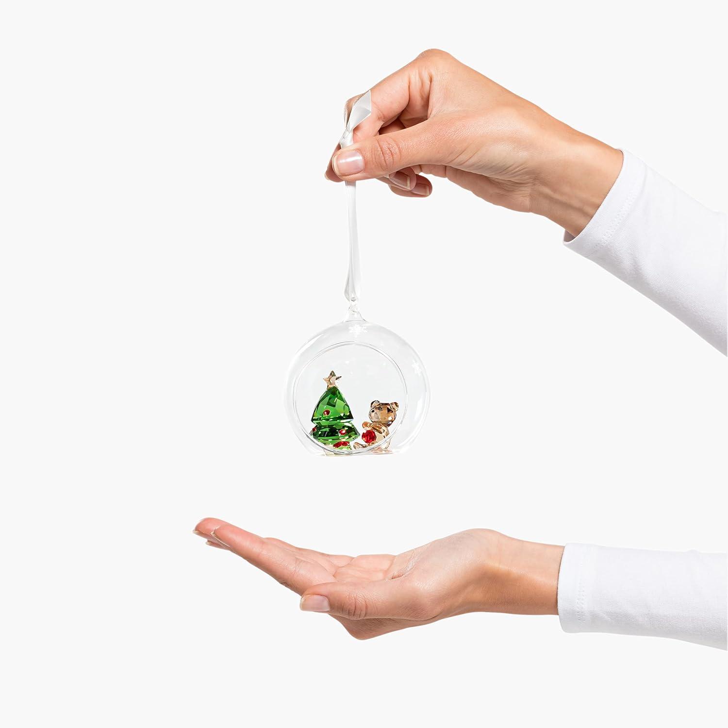 This Swarovski ball ornament has captured childhood memories in loving detail. Inside a hand-crafted, mouth-blown open glass ball, a sparkling crystal teddy bear sits next to a festive tree, with the scene featuring crystals in traditional green and red. The sparkle of the 621 crystal facets is further enhanced by the white ribbon and the delicate white snowflakes printed on the outside of the ball, perfecting the festive scene in a winter wonderland. A charming ornament that will add an emotional touch to your range of decorations, and a perfect gift. Decoration object. Not a toy. Not suitable for children under 15.