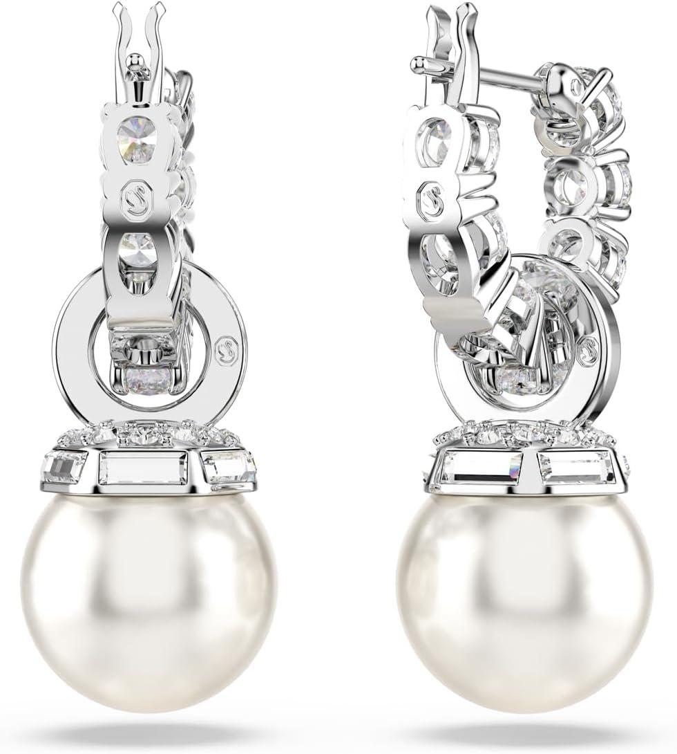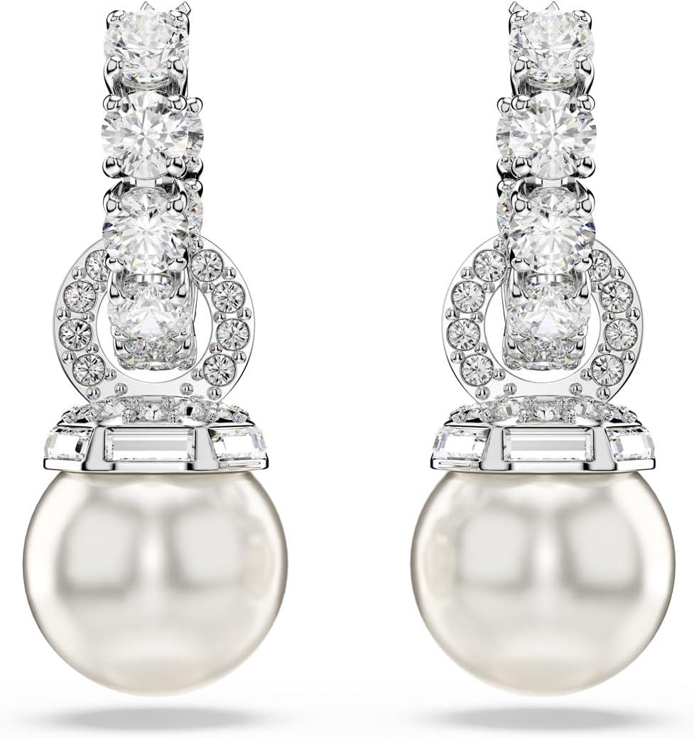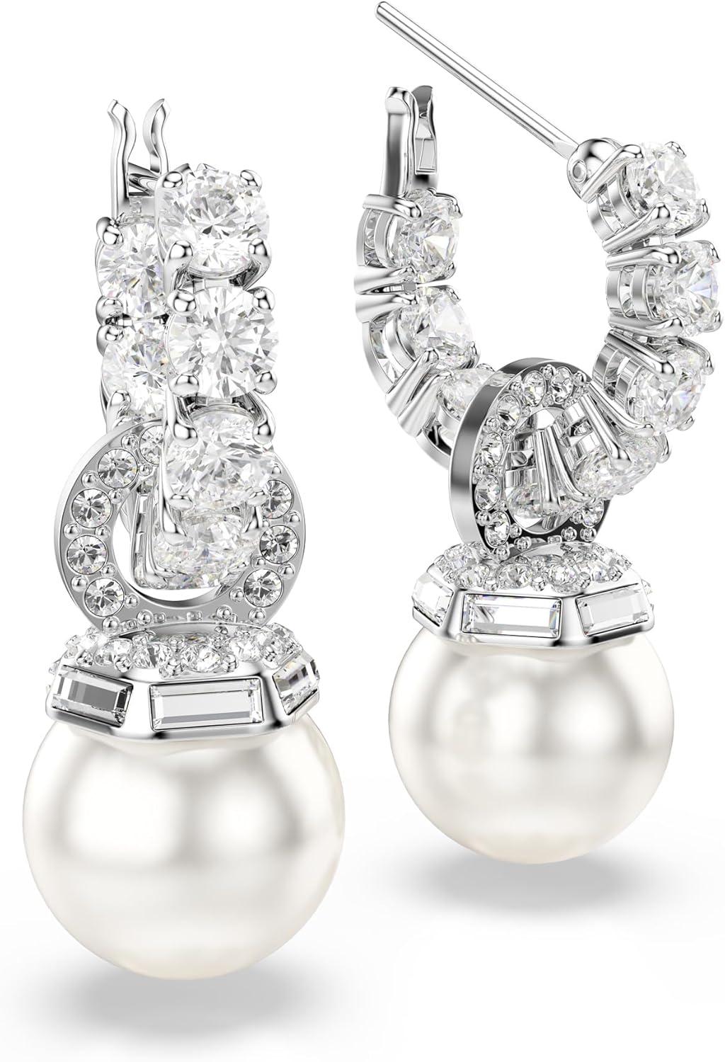 Swarovski Matrix Jewelry Set, Tennis Bracelet, Earrings, Clear Round Cut Crystals With Pearls, Rhodium Finish(Drop Earrings)