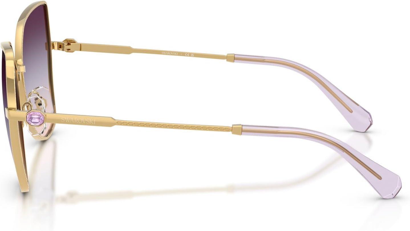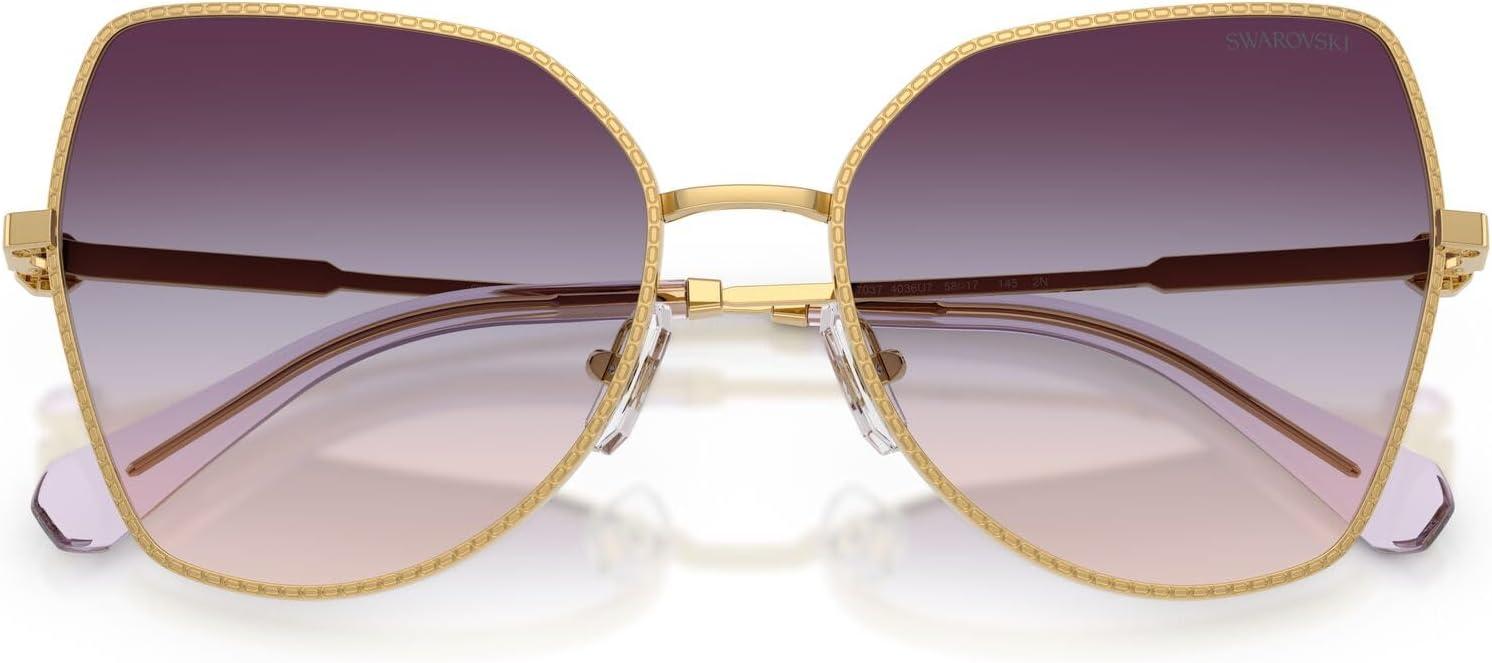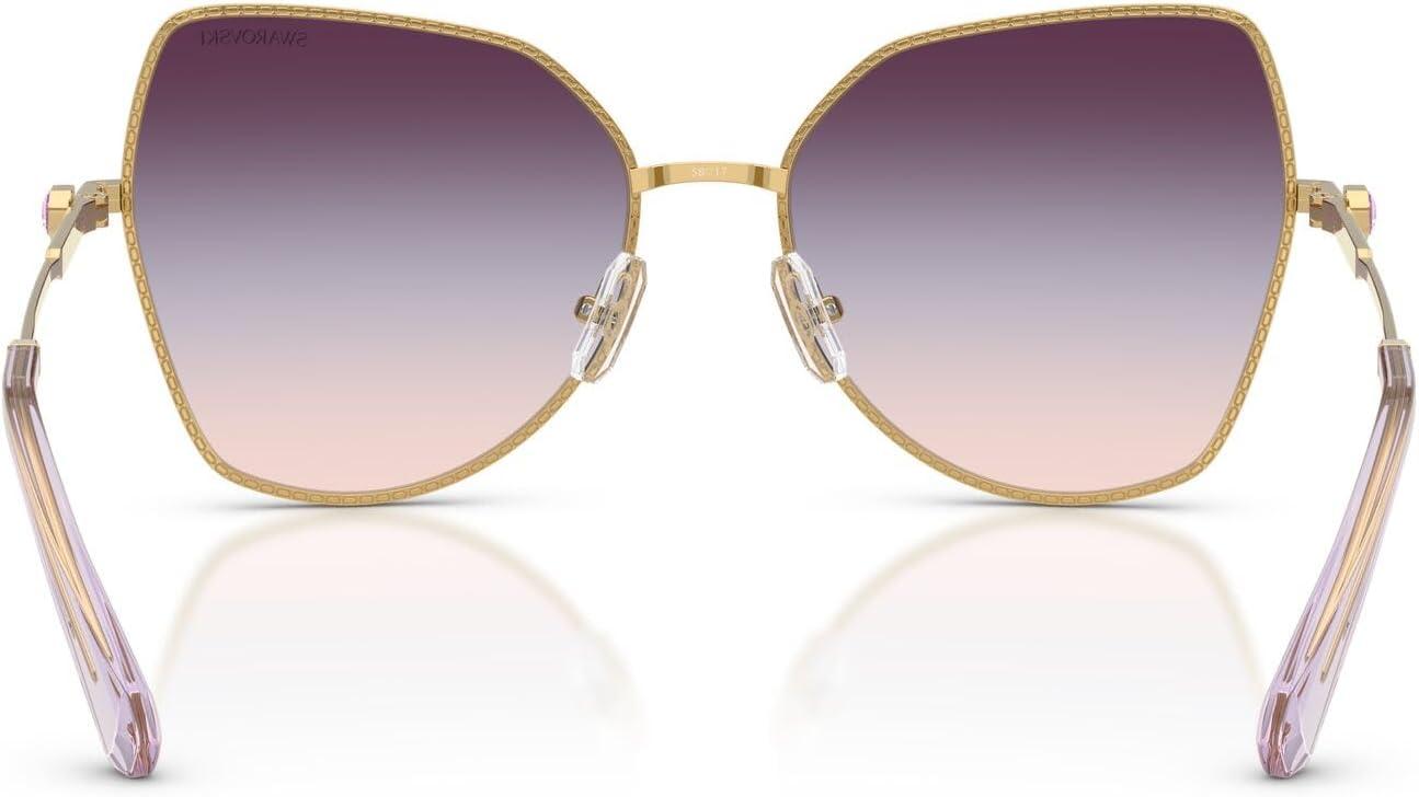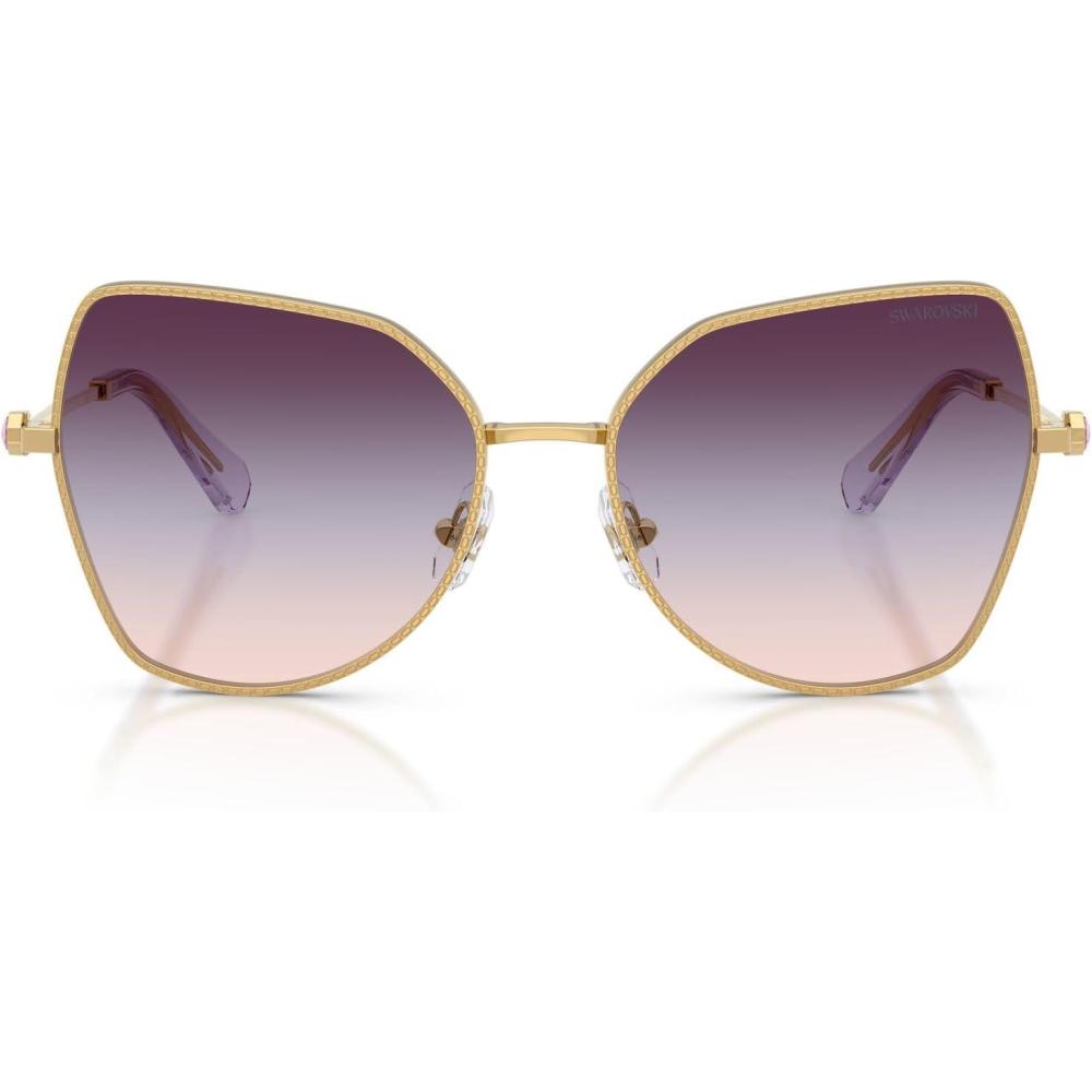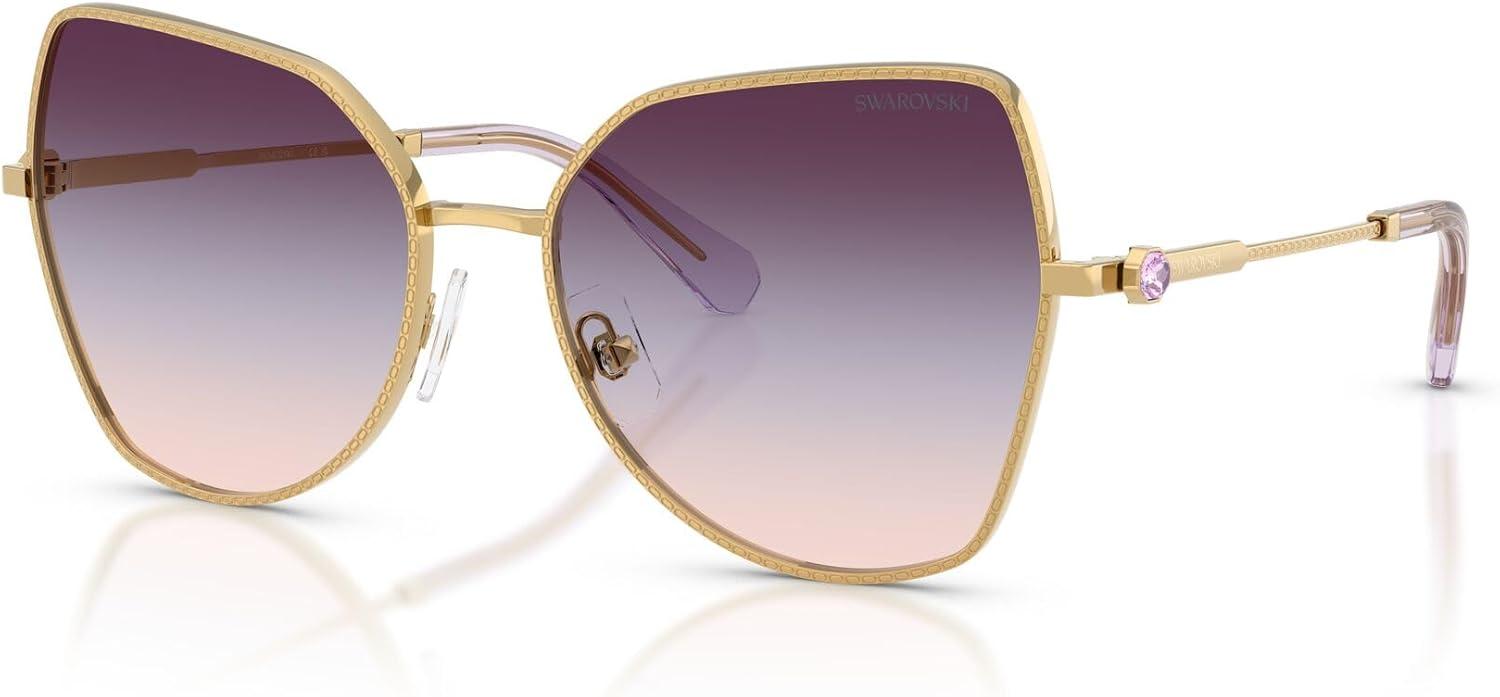 The Swarovski SK7037 sunglasses feature a dramatic butterfly silhouette from the prestigious Millenia collection. Celebrating Swarovski's artistry and craftsmanship, this striking design showcases the metal engraving technique featuring delicate small octagon shapes engraved into the rims and a section of the temples, adding a refined detail to the design. A small octagonal crystal is placed on each temple as a distinctive signifier, positioned just before a subtle logo to enhance the eyewear's polished appearance. Available in a luxurious array of metallic butterfly frames with striking gradient lens combinations, including unique tri-gradient options that create extraordinary visual impact for bold statement-making style. The butterfly shape provides dramatic feminine sophistication and commanding proportions while the crystal-enhanced metal construction ensures exceptional glamour and distinctive luxury that demands attention. Perfect for the fashion-forward individual who values show-stopping design and makes unapologetic style statements, these sunglasses represent the pinnacle of refined craftsmanship and exquisite detailing with premium materials. These statement frames are designed for special occasions and moments when maximum style impact is desired. All lenses offer complete UV protection to shield your eyes from harmful rays during wear. Each pair comes with a protective case and cleaning cloth to preserve your frames and maintain their pristine appearance. Swarovski sunglasses sold by authorized sellers, like Amazon.com, are eligible for all manufacturer warranties and guarantees.
